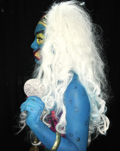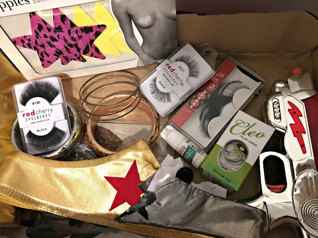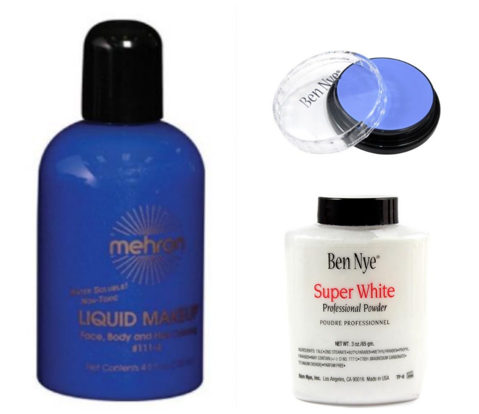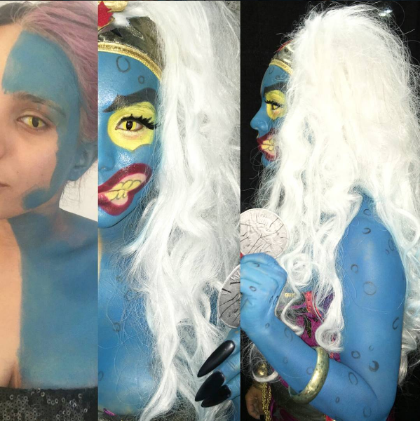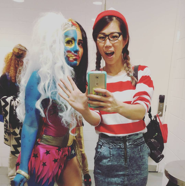 Getting the blue body paint all over half of my body was a body was a mission. Kaori and I started painting away. We used both Mehron Liquid Face Paints which was good but I found to be a tad bit more watery and thin than I wanted... I think it worked as a good base. Over the Mehron Body Paint we used Ben Nye Creme Colors in Sky Blue. I really loved the Ben Nye products! They were pigmented and very thick. Over the makeup we used Ben Nye Classic Translucent Face Powder Super White to set. I became a big fan of Ben Nye products and will surely purchase them again. For my face makeup and colors like yellow or red we used regular Halloween makeup kits that you can find at your local Walgreens like this one HERE. We also used a few colors from our regular makeup bag such as red lipstick etc. I did the regular makeup side for Wonder Woman which was pretty much like an everyday makeup routine.