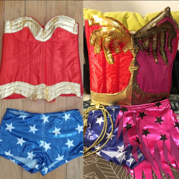Anyway, the next thing we had to worry about was supplies for the costume. I was in Las Vegas while she was in New York so we couldn't work together as much as we wanted to in the beginning. Because of distance and me not being able to try anything on, we thought it best to rework a costume. We went online and I purchased a Wonder Woman inspired costume which you can see HERE. I told Kaori that I liked the Lynda Carter costume embroidery so that she should use that as inspiration. She then went out shopping for trim and for fabric for the Two Face side of the costume. We decided to make the Two Face side part a magenta type of color to keep it a bit feminine. TAH-DAH! With the power of fabric, a needle and thread, embellishments and a glue gun, Kaori did a stellar job. I was super impressed.