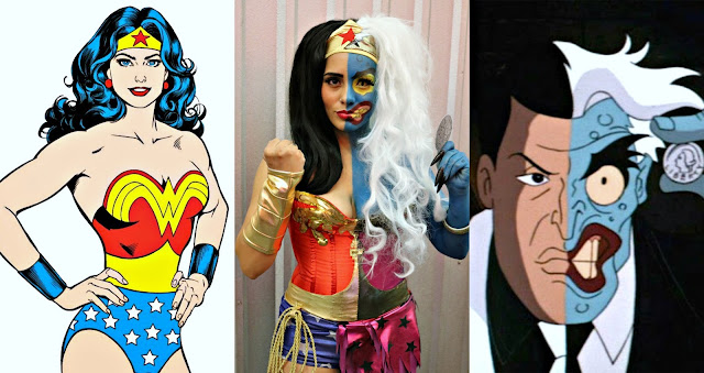 The idea was born while we were brainstorming one day. Kaori asked me if I knew who I wanted to cosplay for New York Comic Con. I still had no idea and she suggested I do Wonder Woman. At first I said "No, Wonder Woman is a bit overdone, I want to do something a bit more creative this year... What about Two Face?" Then she suggested why don't we do both and BOOM! The idea was born. Kaori had a small art series the year before were she mash ups of some Disney characters with DC Comics Two Face. She was no stranger to the concept. She the sketch she created for the cosplay below.