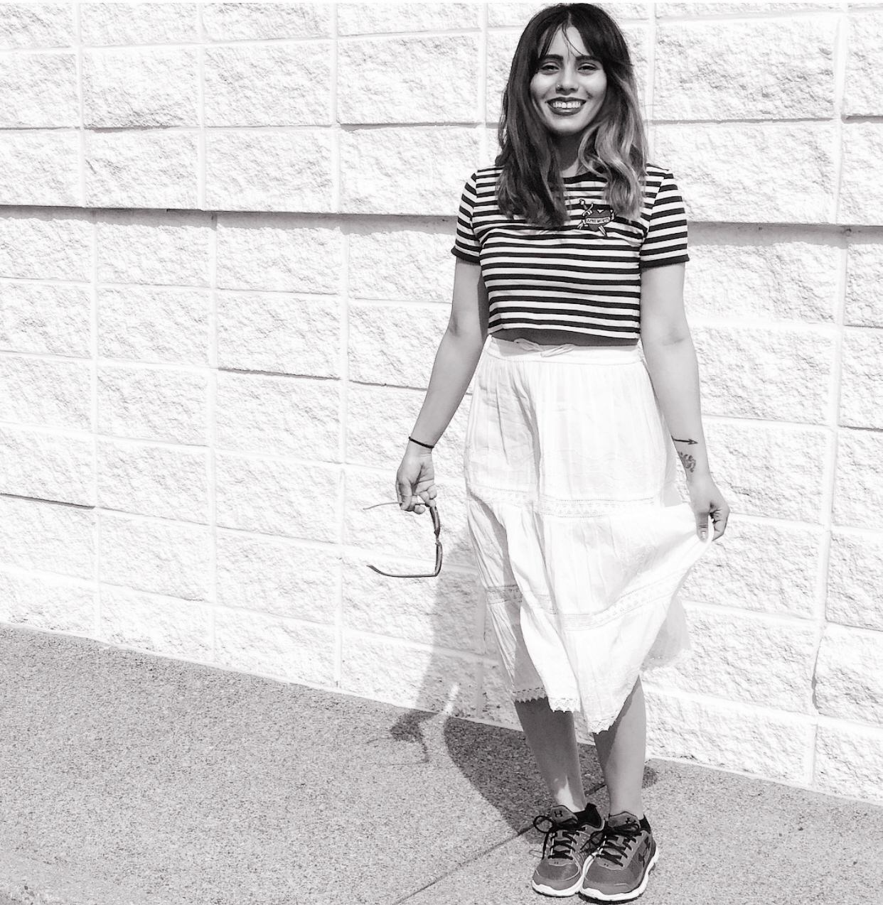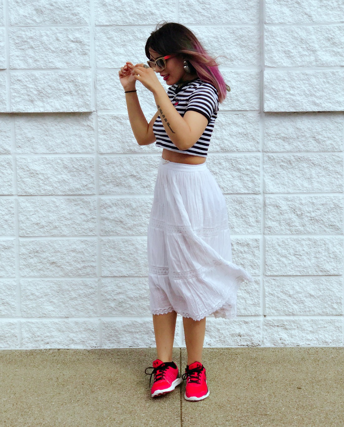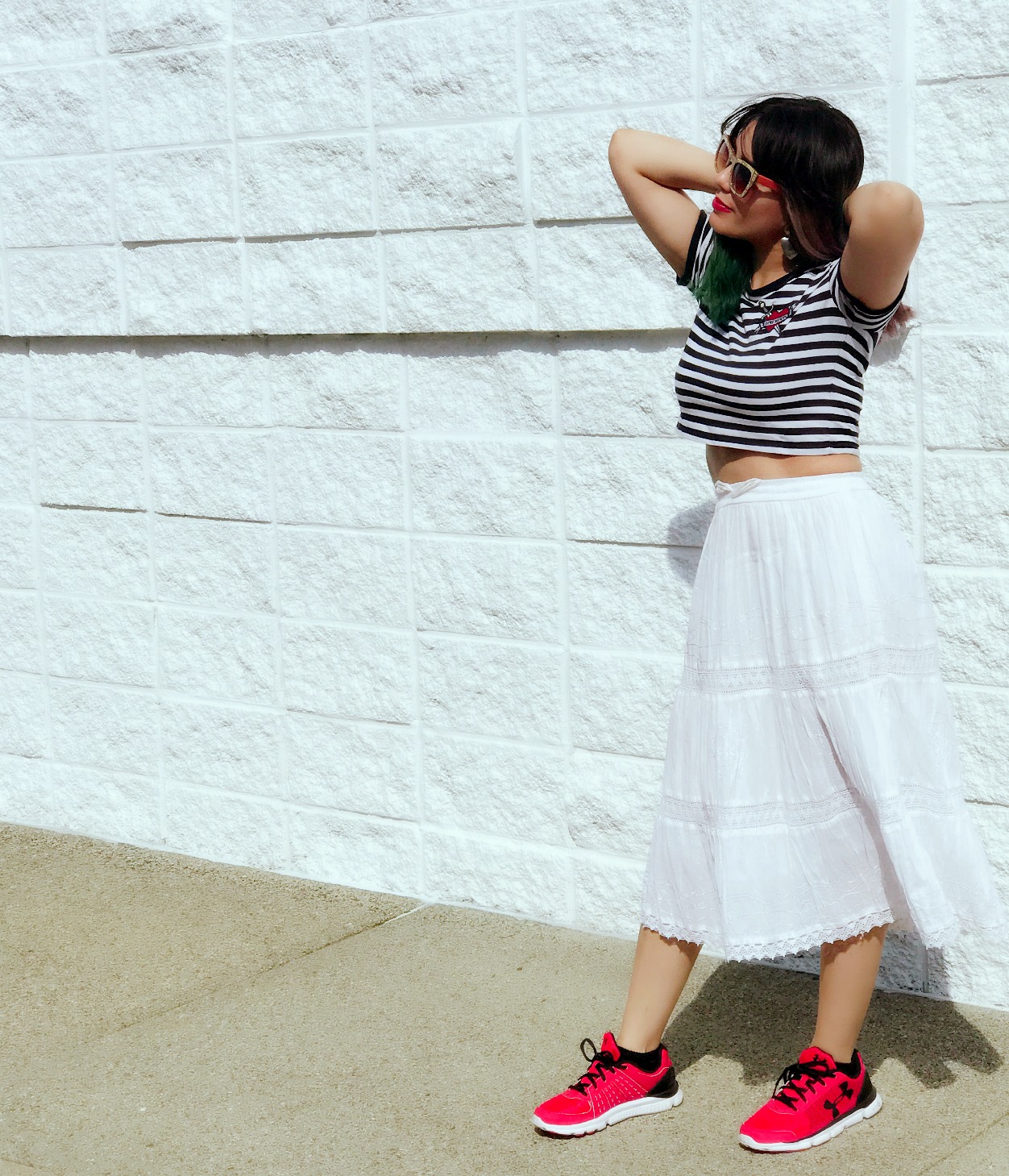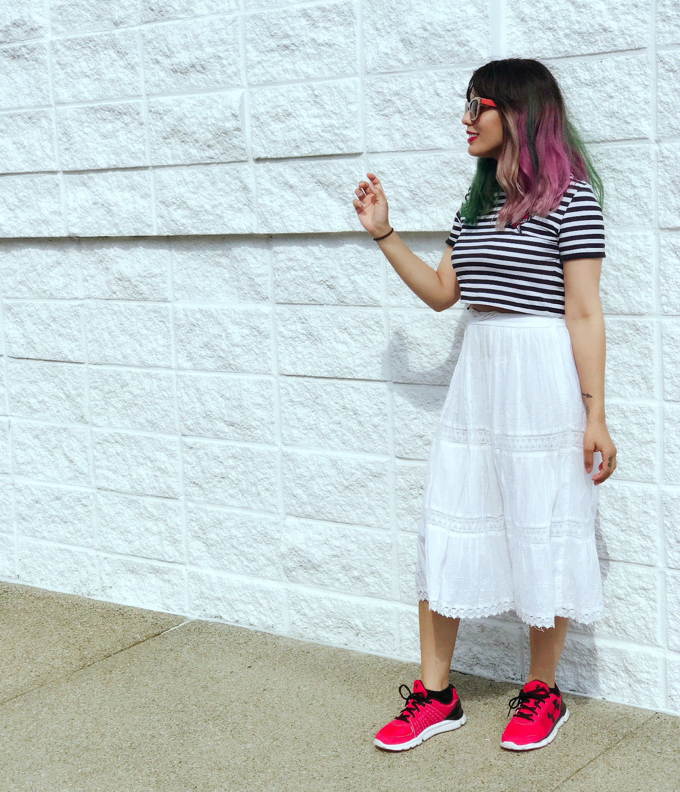 Outfit Details: When it comes to fashion it still has a special place in my heart! Maybe not to write about it as much as I once did, but I do love taking photos of my outfits and sharing my personal style and what influences me. This was a very hot day. I wore this nice white skirt which is pretty brave for my clumsy butt with a cute little striped shirt I picked up at H&M about 2 months ago. The top has a l patch with a heart and a dagger going through it that says "Love Hurts". I purchased this skirt years ago from a random shop for like $10 probably. It reminded me of the kind of thing my mother would buy for me or bring my back from Colombia. My sneakers are Under Armour. I think I've always been into the comfortable fashion look. I usually only wear high heels so events or randomly once in a blue. I've always been a sneakers and combat boot kind of girl.