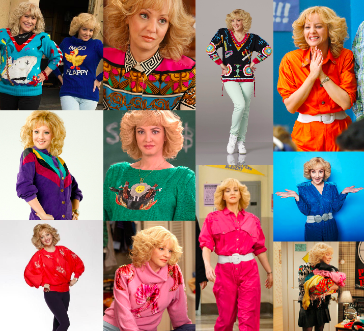 Beverly Goldberg played by Wendi McLendon-Covey, is not only one the greatest & most admired smothers on earth, but she's a grade-A fashionista too. Her sweater game is pretty much 80's perfection that can't be messed with and her embellishments are to die for. My mom didn't keep too many of her outfits from the 80's, which makes me go to thrift stores searching for so many things that look like the ensembles you'll see below. I'm still on the hunt for jumpsuits like the pink, orange, & blue ones seen in this college. So many of these looks have been back in style recently, such as the funky patterns and windbreaker / tracksuit jackets. One thing you need to remember kiddies is that it's not just what she's wearing, it's the confidence she does it with. I read in an interview somewhere that Beverly Goldberg provided Wendi McLendon-Covey with a box of her old sweaters and she wears them on the show, that's pretty bad ass! You go Momma Goldberg! Both of you.