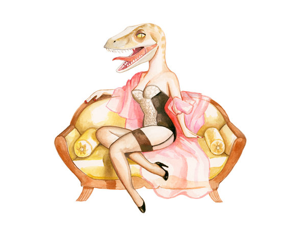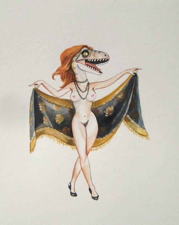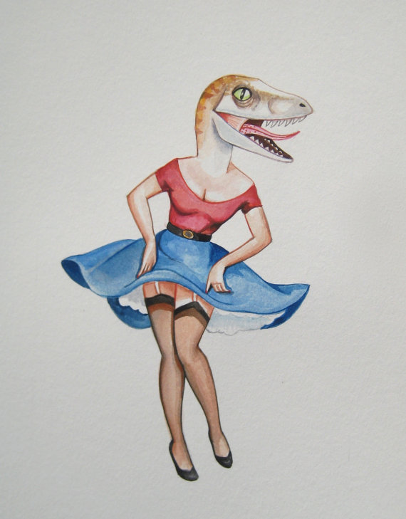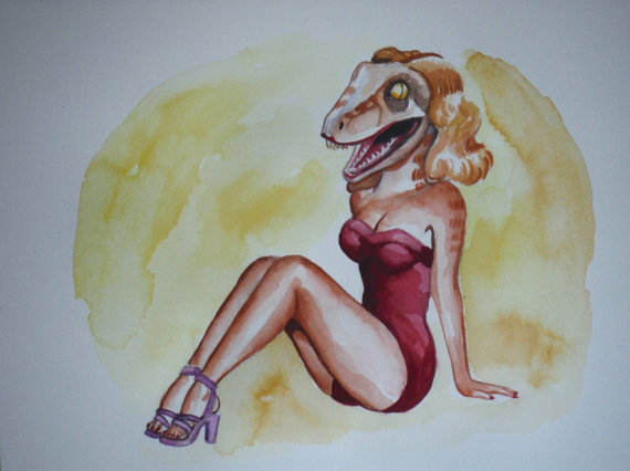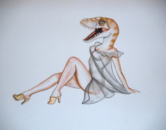 I love pinup girls and I love dinosaurs... finding both in art form was a great treasure! You can find a unique gift on Sleepybowie's Etsy shop for your beau or friend.