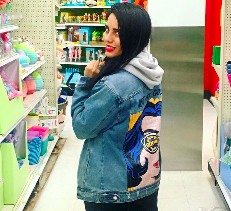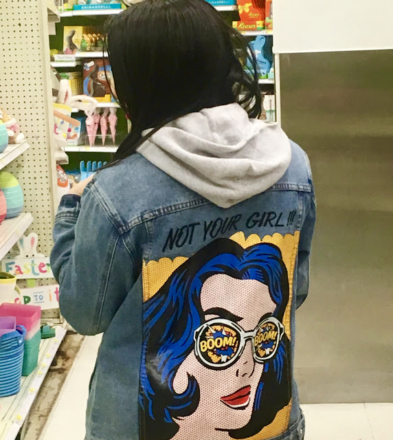 Wearing Roy Lichtenstein art inspired denim jacket from Mandees , Hoodie by Levis, Black slacks from H&M, Black Combat Books by Steve Madden.