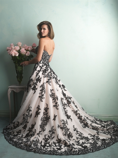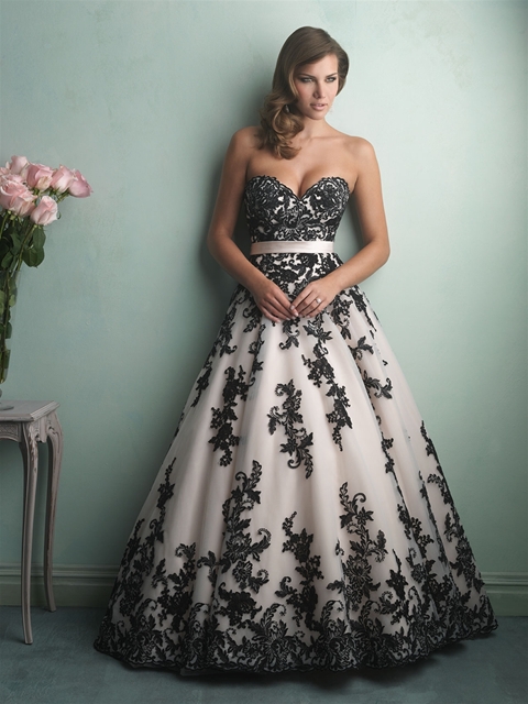 "This strapless ballgown ranges from sweetly elegant in a classic ivory to dramatic and glamourous black lace Appliques over champagne English net. The choice is yours."