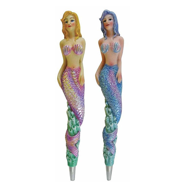 "Sign on the dotted line with these two beauties from the ocean deep. One blonde with a pink, purple, and yellow shimmery tail, the other with blue hair and a matching blue and purple tail. Each one with her tail wrapped around a coral outcrop, leading down to a pen tip where all of their mythical inspiration will come pouring out."