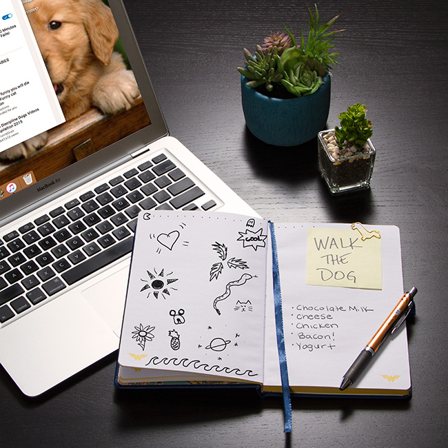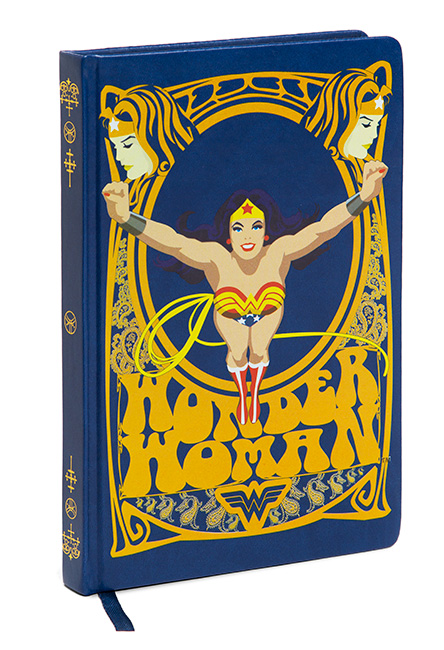 "Celebrate retro Wonder Woman mashed up with a bit of Wonder Woman from today with this Wonder Woman Lasso of Truth Journal. The front has a very "Keep On Truckin', Diana!" vibe. And the endpapers are 80s Wonder Woman. The spine, however, sneakily features symbols from her sword in Batman v Superman. So this journal is for the true fan through the ages!"