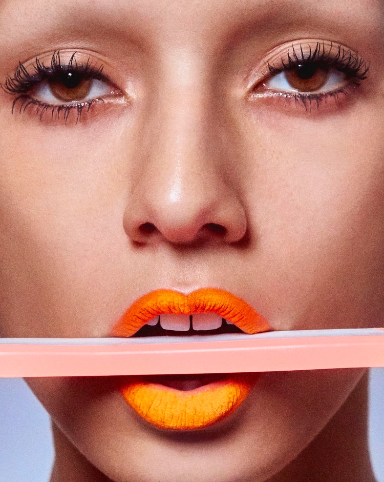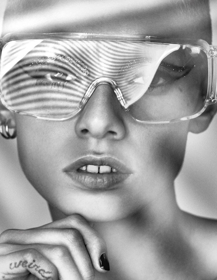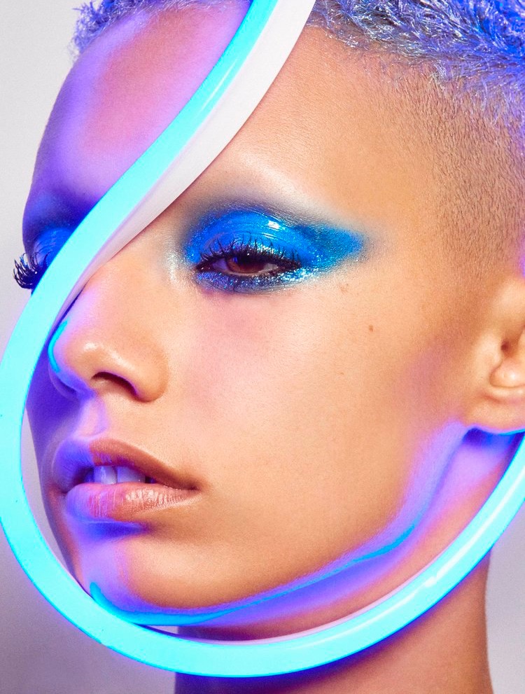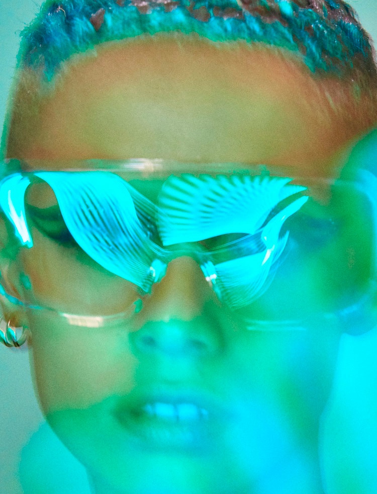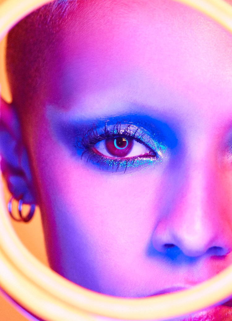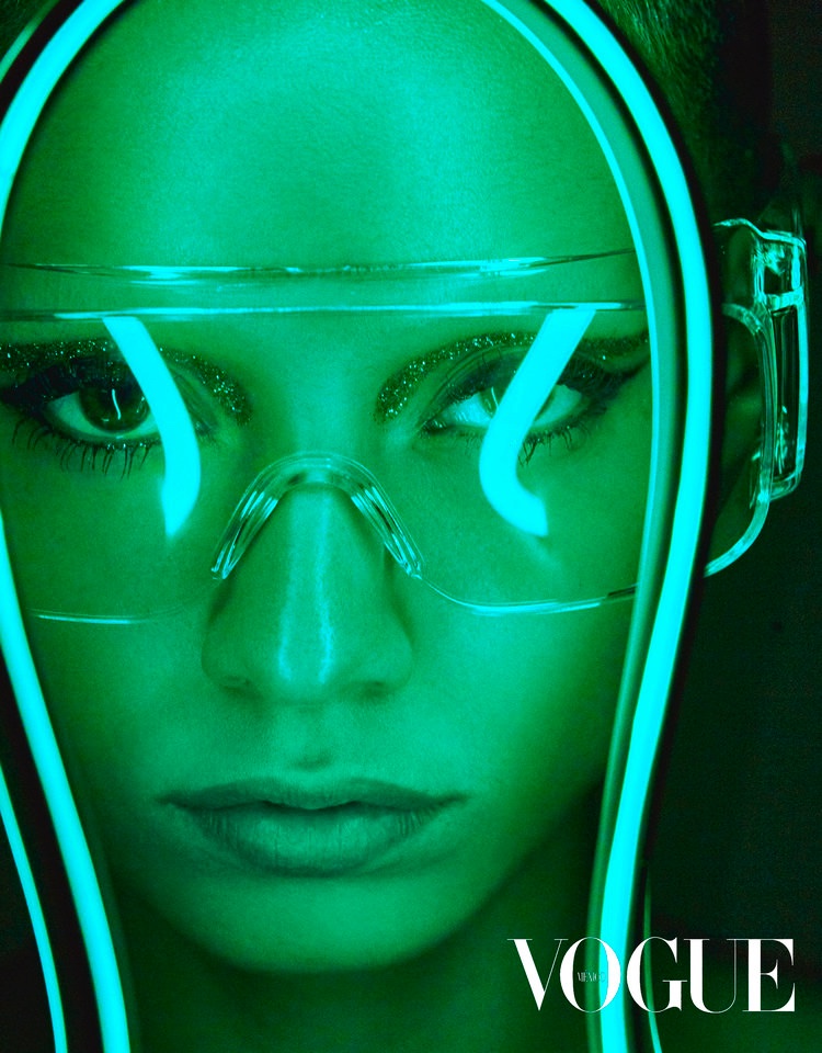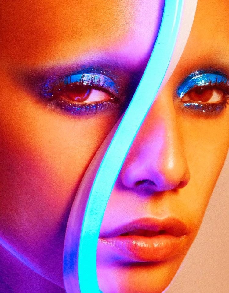 There are so many details to admire from this shoot. The glittering eyeshadow, bold lipstick, fierce cat-eyes and more. Shooting with neon lights and blacklights looks like such a fun time. This is a very futuristic, edgy style. Jazzelle Zanaughtti's makeup was done by Yuki Hayashi, who did an amazing job. Also, I'm smitten with those sunglasses! All the elements of this photoshoot compliment each other so well and you can tell there was some great teamwork here.