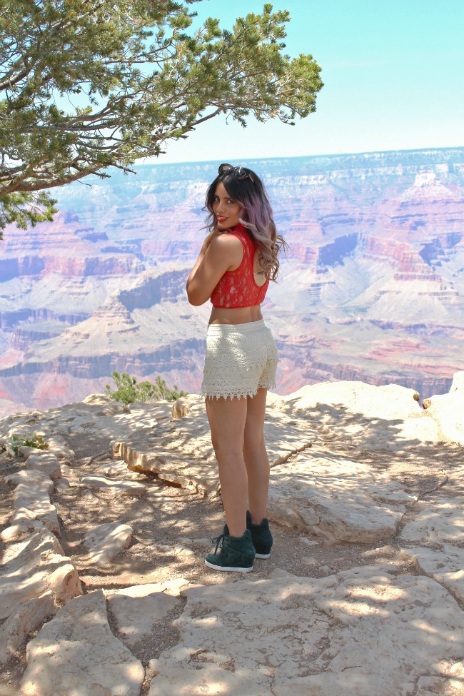 When it came to outfit decisions, I was torn on what to wear. I wanted to wear something cute and comfortable. I found the lace shorts at ROSS and my lace crop top was from a thrift store. They looked really cute together and complimented each other well.  I LOVE my Ash Sneaker Wedges but perhaps they weren't my smartest choice for a hiking trip. You will be very high up and feel like you need to catch your breathe at times. I recommend regular sneakers or preferable a nice pair of hiking sneakers.