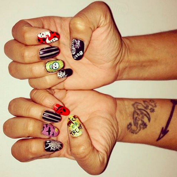 Trick or treat nails! This is a cute but scary manicure Monday. My sister in law loves to draw awesome little things, she's all about that Do It Yourself life. In honor of Halloween coming up, she gifted me with these pretty nails. Here you'll see she drew ghost, pumpkins, bats, spider webs, a mummy and more. Super kawaii right?