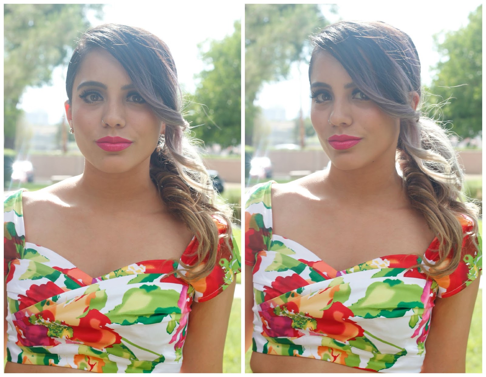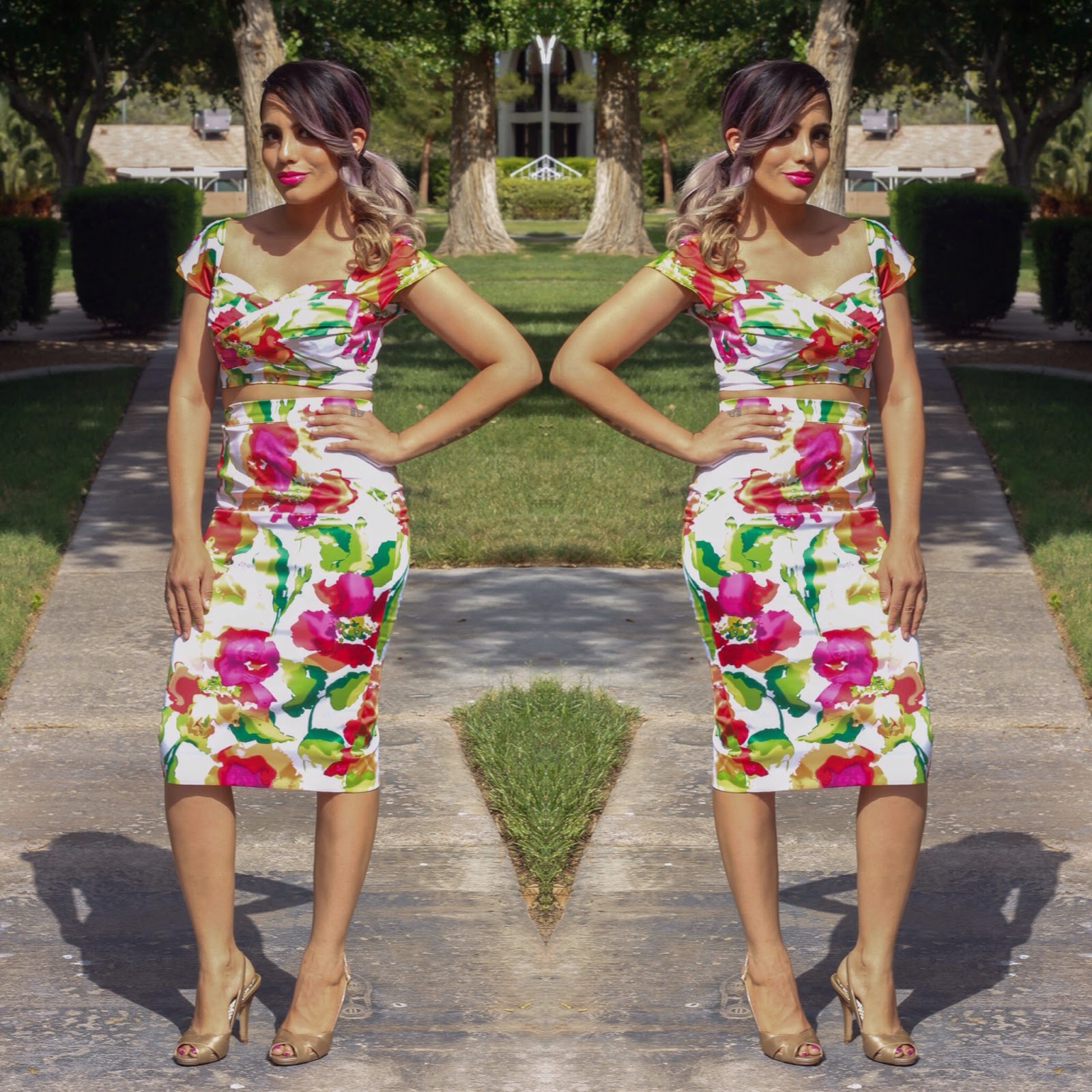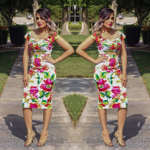 I decided to go with a 2 piece this time instead of a 1 piece dress. I decided it added a little flirty sensation to the look. I am also completely smitten with the big flower pattern on the dress. They look like tropical flowers. Something about tropical flowers makes me smile.... they make me think of planning a beautiful vacation.